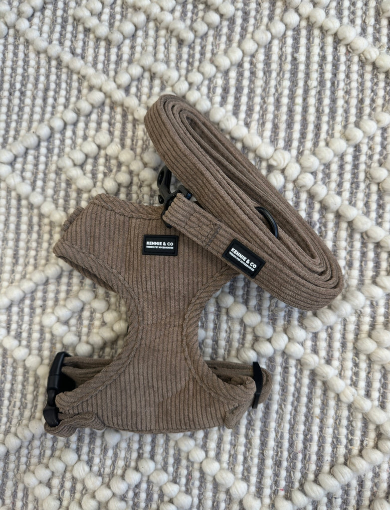 The set features a classy corduroy material and the harness is fully adjustable with a D Ring Attachment for leads.