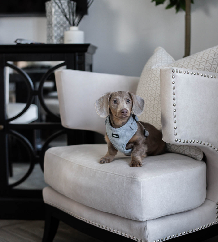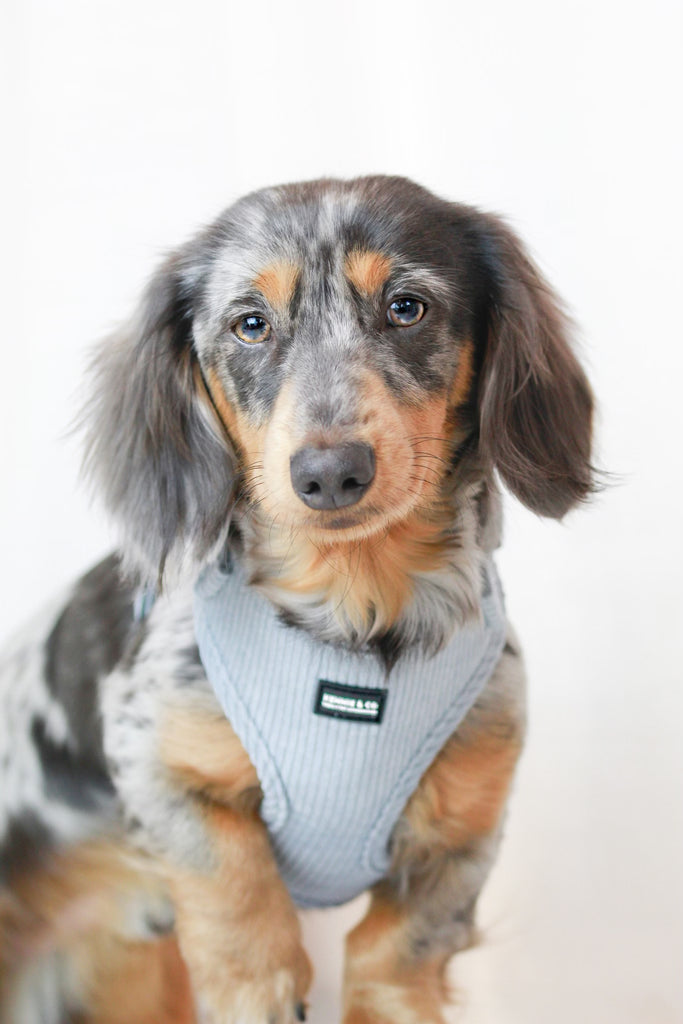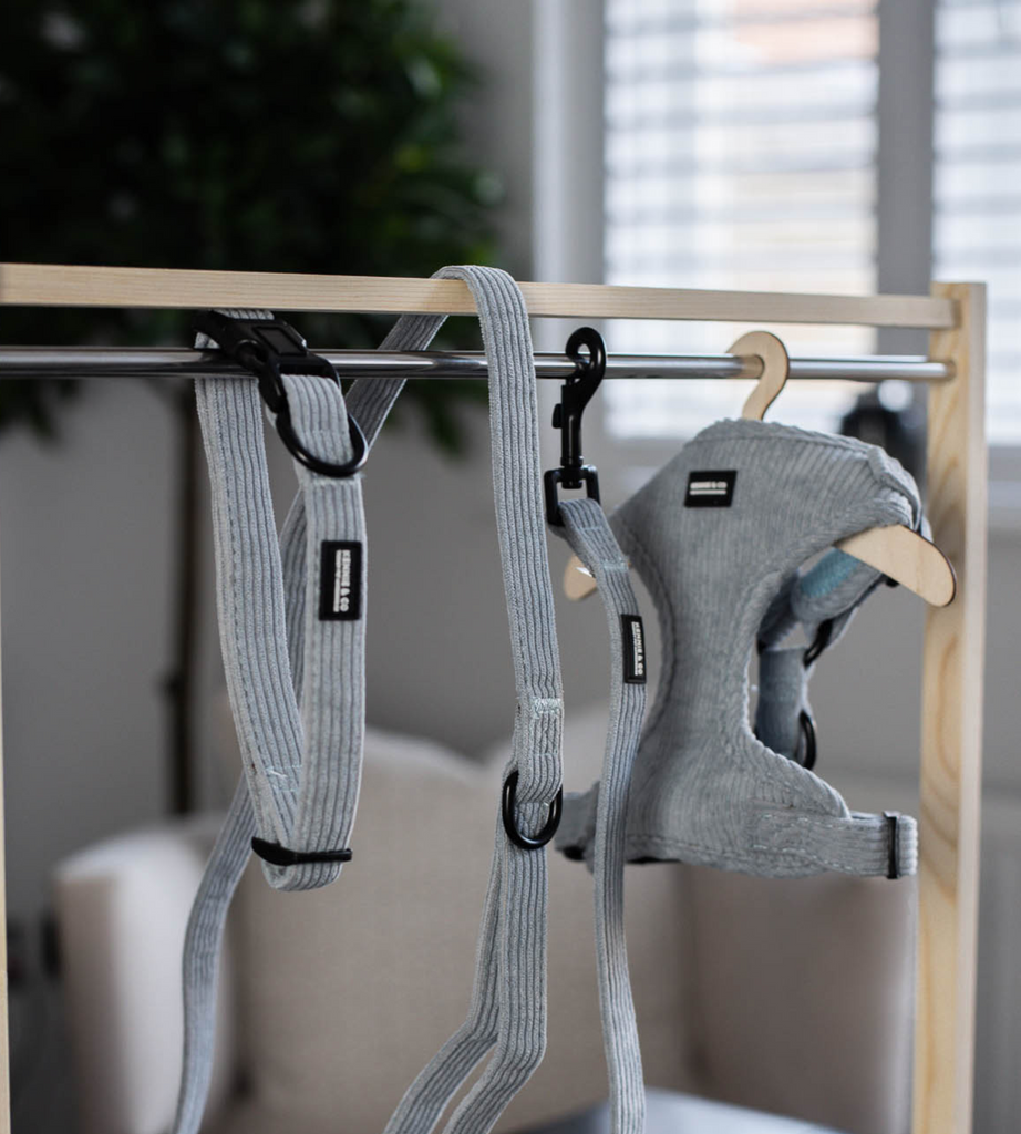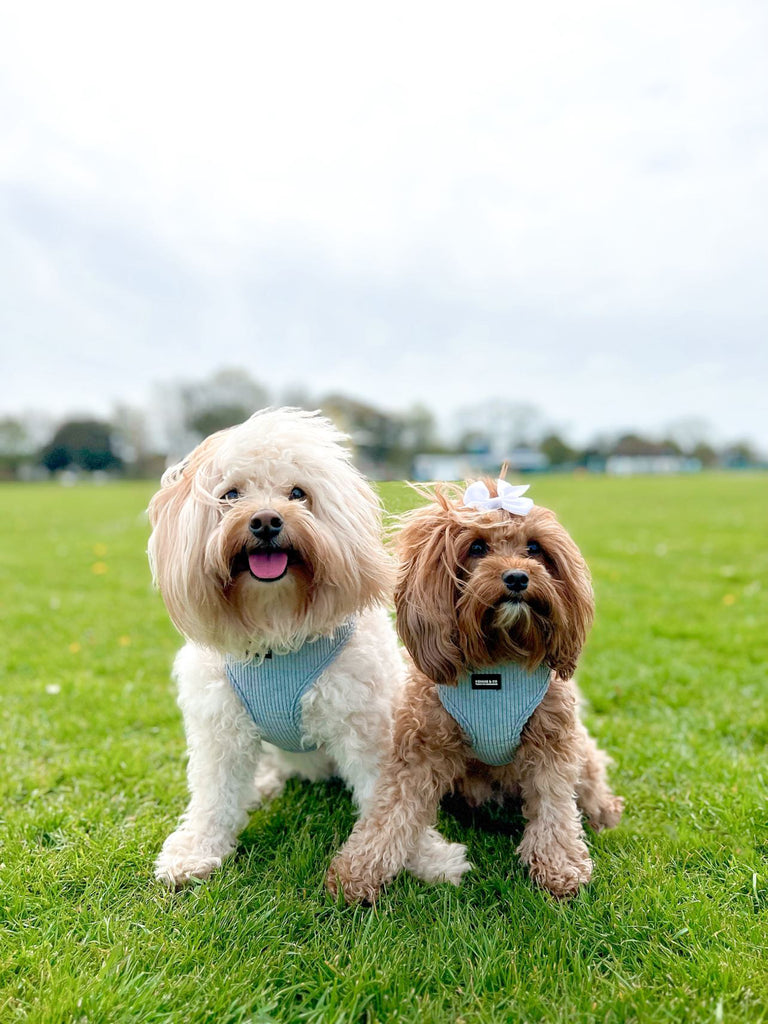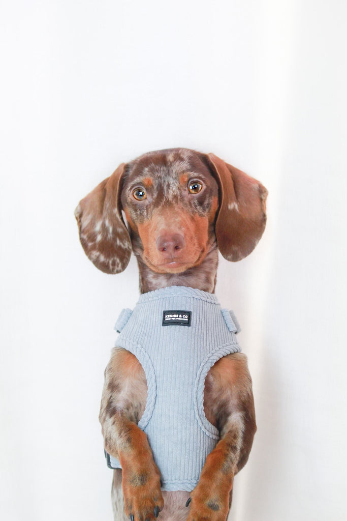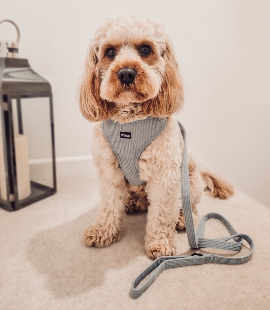 Our Marley Harness features a blue corduroy material and is fully adjustable with a D Ring Attachment for leads.